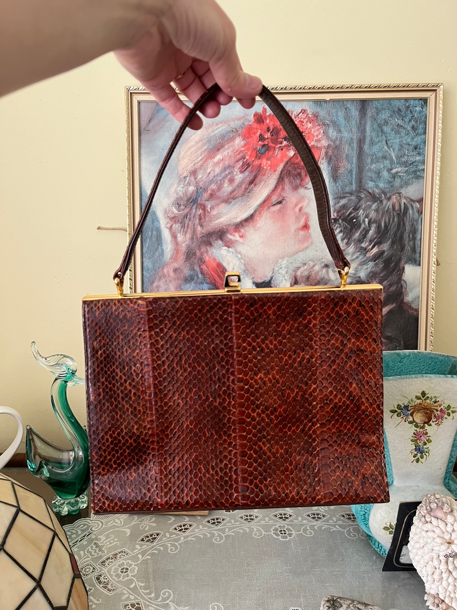 1950s vintage Simon Martin London handbag, crafted from genuine snakeskin in a rich, warm brown tone.