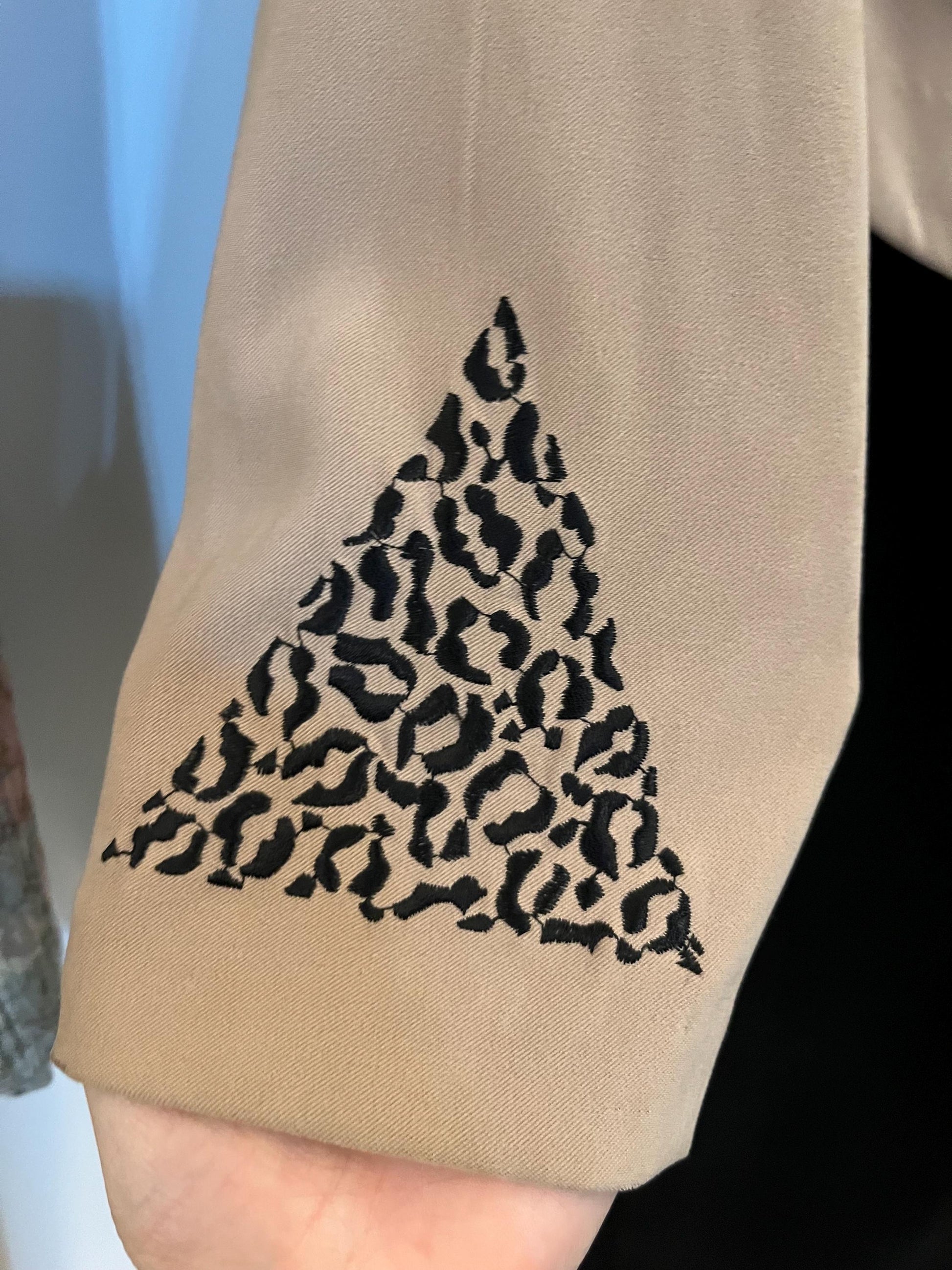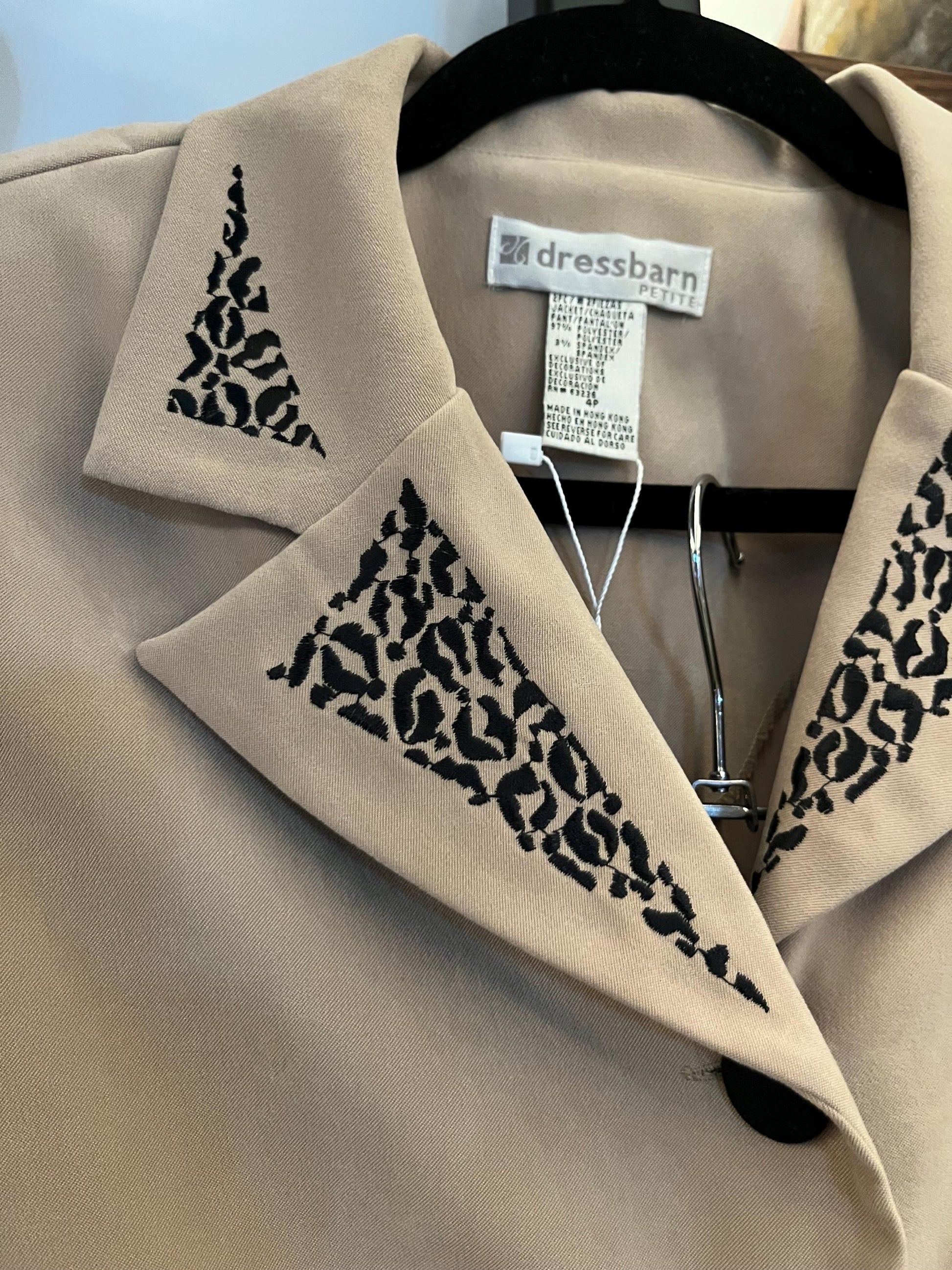 The jacket is a cream colour with animal print on the cuffs and lapels, with large black buttons with hight waisted straight leg black trousers.