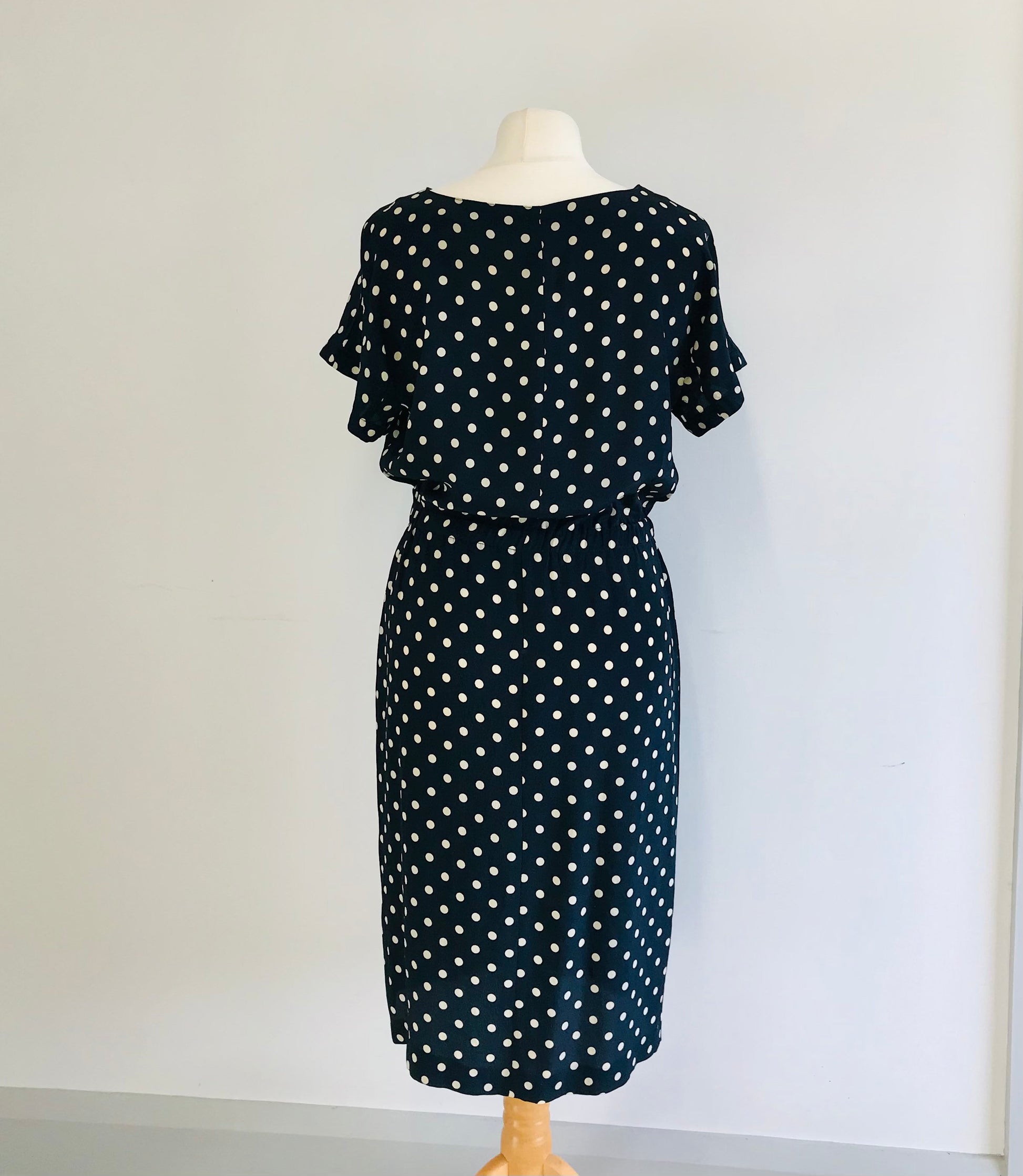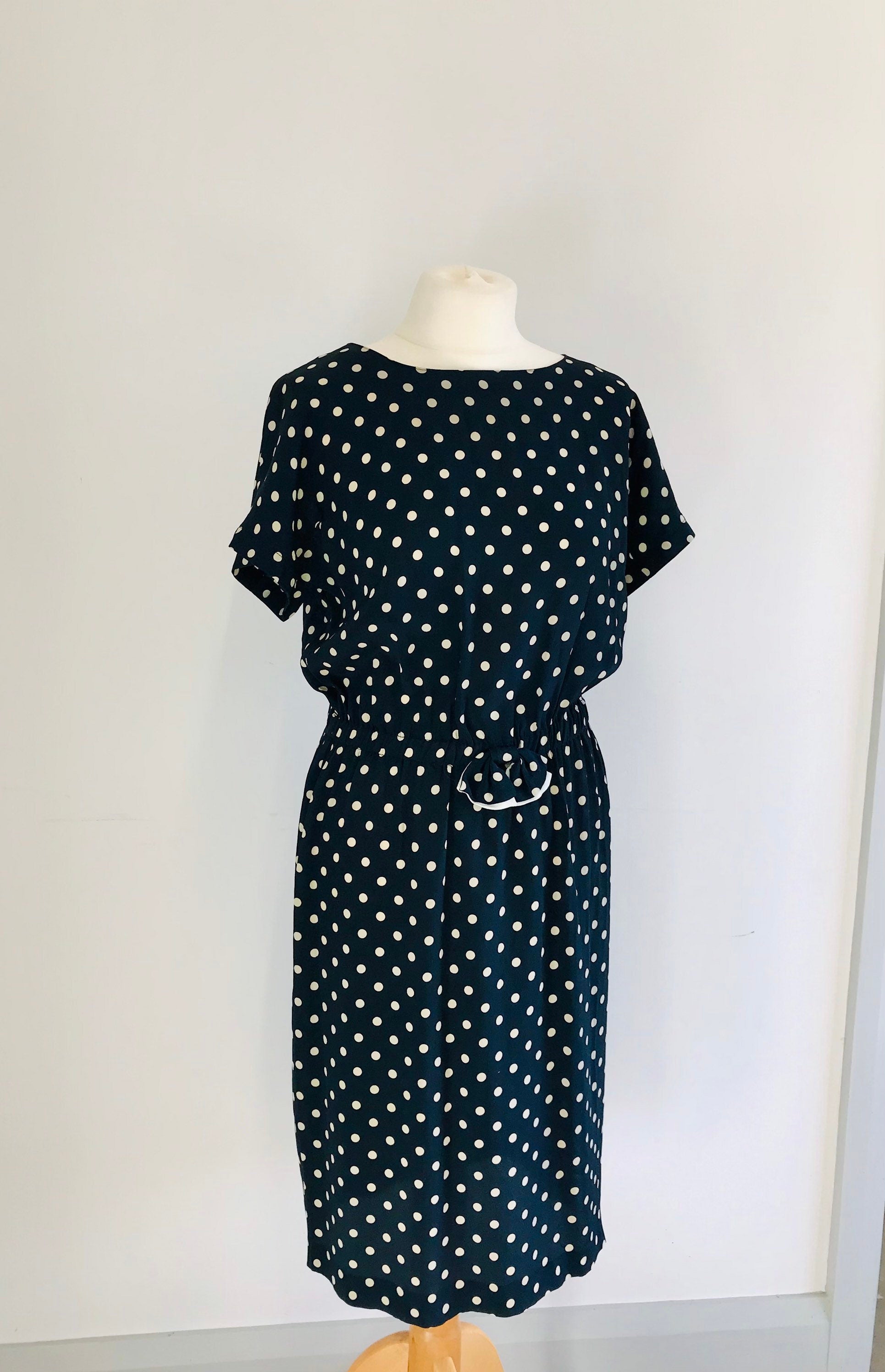 Vintage Dresses - Navy and White Midi - Polka Dots - Size 12 With Bow at Waist