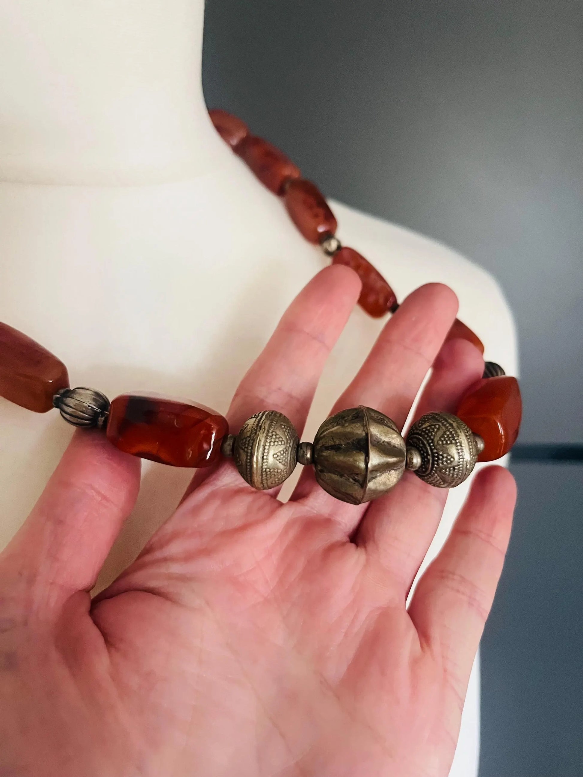 Vintage 1970s Boho Beaded Necklace | Chunky Brown Orange Stones | Silver Tone Accents | Statement Art Jewelry | Intricate Detailing - Frock33