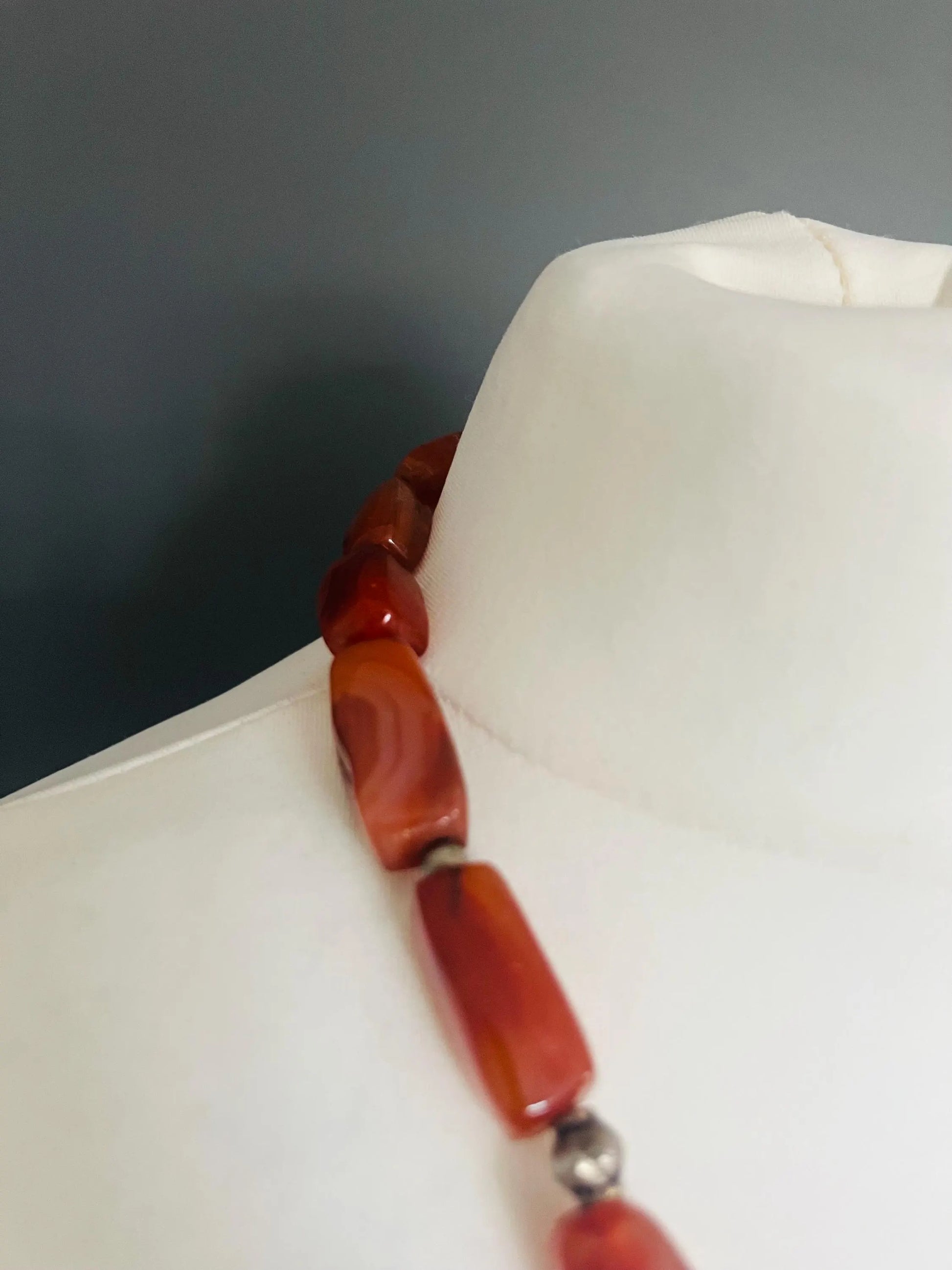 Step back into the free-spirited 1970s with this beautiful vintage beaded necklace, crafted with chunky brown-orange stones and silver-tone center beads featuring intricate etched detailing. A true boho statement piece, this necklace blends earthy tones with artistic metalwork, making it perfect for lovers of retro, festival, or eclectic styles.